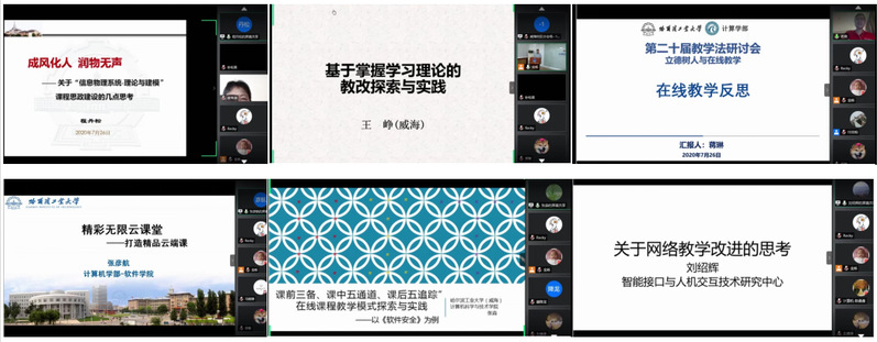 参加本次研讨会的一校三区老师围绕“立德树人与在线教学”主题进行在线教学交流。程丹松(本部)、王峥(威海校区)、蒋琳(深圳校区)、张彦航(本部)、张淼(威海校区)、刘绍辉(本部)六位老师分别作了题为《成风化人,润物无声----关于“信息物理网络理论与建模”课程思政建设的几点思考》、《基于掌握学习的<高级程序设计语言 I>课程教改探索与实践》、《线上教学反思》、《精彩无限云课堂》、《“课前三备、课中五通道、课后五追踪”在线课程教学模式探索与实践》、《关于网络教学改进的思考》的交流报告。