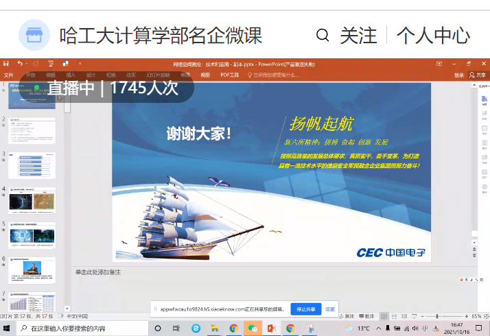 为深入宣传贯彻习近平总书记关于网络强国的重要思想,宣传贯彻习近平总书记对网络安全工作“四个坚持”的重要指示,2021年10月16日计算学部邀请中国电子信息产业集团有限公司第六研究所网络测量室副主任、正高级工程师苏马婧老师为学生带来一节线上微课程——《绘制网络空间地图,保卫第五疆域安全》。本次课程由开云官方版网站登录入口副书记、辅导员董如月老师主持,来自全校各学院(部)的同学通过小鹅通平台参与听课,累计在线听课达到1745人次。