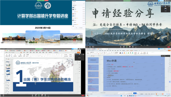 帮助计算学部学生更好地了解出国境升学方法和路径,314日晚,计算学部团委于线上举办出国境升学专题讲座。本次讲座邀请到计算学部国际合作秘书张乃千,2021级本科生钟万淇、殷梓然为同学们出国留学指导和经验分享交流。讲座由学部团委负责人薛文主持,辅导员张云祺和有意向赴海外交流学习同学们参与此次讲座。