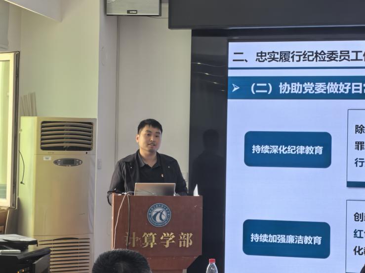 为推进深入贯彻中央八项规定精神学习教育走深走实,进一步严明纪律规矩,营造风清气正的良好氛围,计算学部党委于6月12日在综合楼618会议室召开教师纪检委员专题培训会。学部全体教师纪检委员参会,会议由计算学部纪检委员邬向前同志主持。